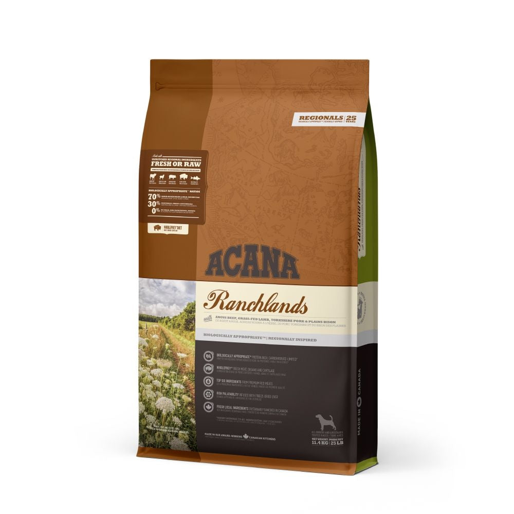 ACANA Ranchlands potpuna je hrana za pse i sadrži jedinstvene svježe regionalne sastojke, uključujući crveno meso životinja uzgojenih na ranču i divlje ribe ulovljene na održiv način u zapadnoj Kanadi.