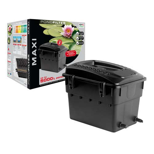 Filteri za jezerca iz Aquael Maxi linije dizajnirani su kako bi pružili učinikovito mehaničko i biološko filtriranje vode u vrtnim jezercima. Prikladni su za korištenje u malim jezercima za uzgoj riba. Filter se sastoji od zatvorenog spremnika ispunjenog filter materijalom. Dizajnom su prilagođeni za instalaciju u samom jezercu potpuno uronjenim u vodu te izvan njega. Svaka od tih metoda instalacije ima svoje prednosti i mane. Kod postavljanja izvan jezerca, pomoću pumpe i crijeva voda se distribuira kroz filter. Prolaskom kroz filter materijale čista voda vraća se u jezero. Prednosti ovog načina montaže su lakše održavanje zbog olakšanog pristupa i činjenica da filter ne zauzima puno mjesta u jezercu. Nedostak ovakve montaže jest vizualan, filter montiran na obali može pokvariti izgled jezerca. Glavna prednost filtera montiranog ispod površine vode je to što ne kvari izgled jezerca. Nedostatci se očituju u otežanom pristupu za održavanje te što filter zauzima mjesta u jezercu. Prvi nedostatak ima manju važnost u velikim jezercima, no drugi nedostatak je bitan ako se ne može održati čistoća vode zbog problema u održavanju (kao što su prekomjerno hranjenje riba ili prekomjerna gnojidba biljaka). U jezercu koje se pravilno održava te se vrši razumna hranidba, MAXI filteri se trebaju čistiti jednom u sezoni, te se nakon iste tijekom zimskih mjeseci stagnacije filter vadi, rastavlja i sprema na zaštićeno mjesto.