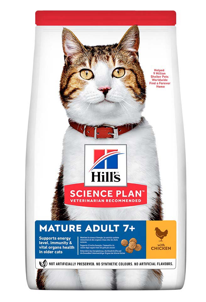 Hill's™ SCIENCE PLAN™ MATURE ADULT 7+ CAT sa piletinom (piletina 13%, ukupno perad 20%) je potpuna hrana za mačke od 7 godina života.
