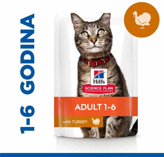 Hill's Science Plan Adult Hrana za Mačke s Puretinom 85 g (puretina 4%) mesni komadići u umaku je potpuna mokra hrana za odrasle mačke u dobi od 1 do 6 godina.