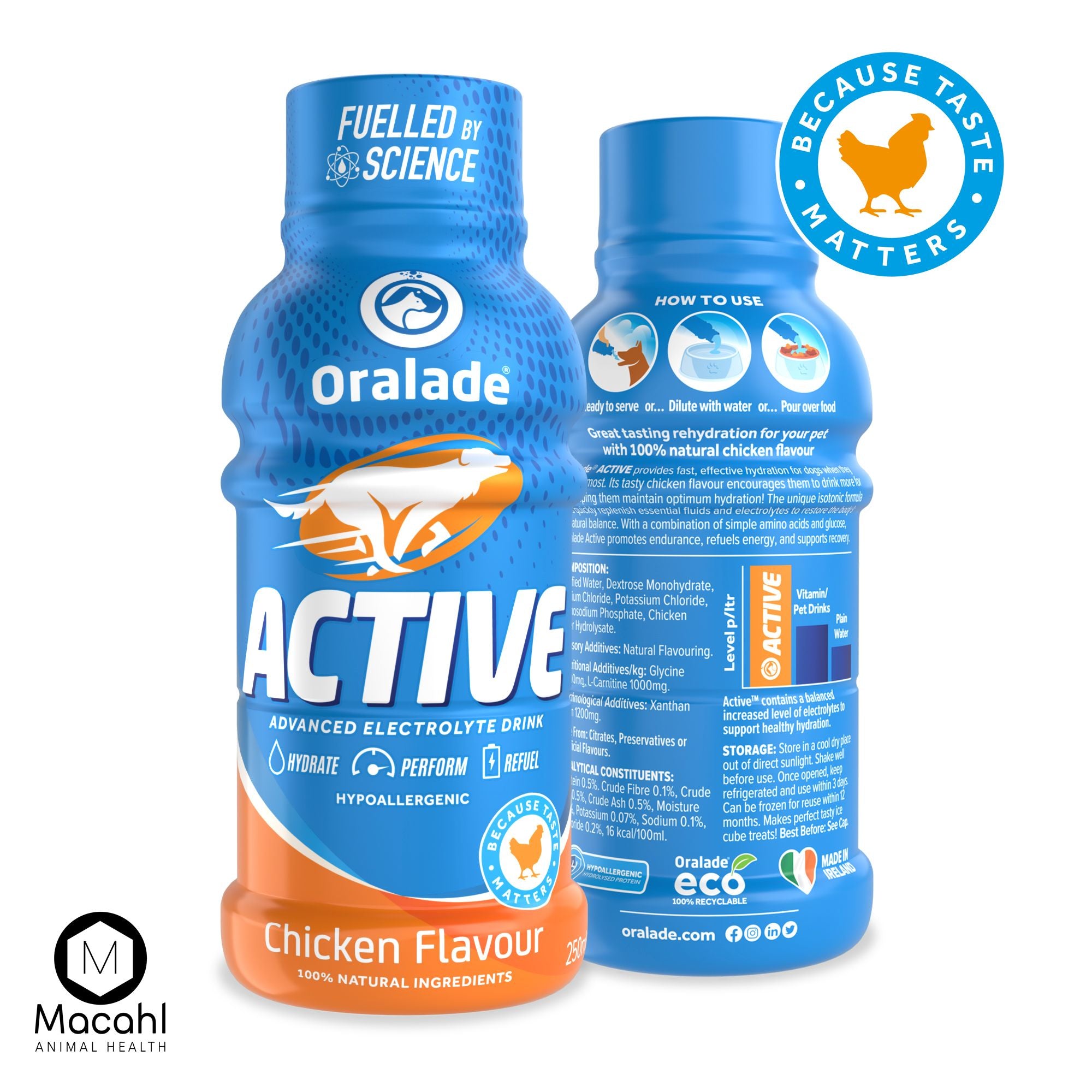 Oralade® ACTIVE pruža brzu, učinkovitu hidrataciju za pse kada im je najpotrebnija. Njegov ukusan okus piletine potiče ih da duže piju više, pomažući im u održavanju optimalne hidratacije! Jedinstvena izotonična formula pomaže u brzom obnavljanju esencijalnih tekućina i elektrolita kako bi se vratila prirodna ravnoteža tijela. Kombinacijom jednostavnih aminokiselina i glukoze, Oralade Active potiče izdržljivost, puni energiju gorivom i podržava oporavak.