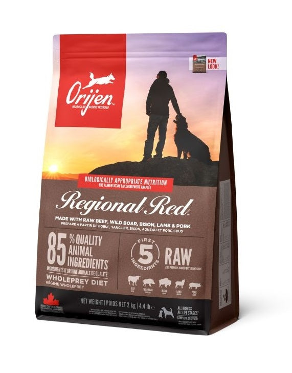 Po uzoru na prirodnu prehranu, Orijen Regional Red hrana prepuna je bjelančevina iz mesa Angus goveda, vepra, bizona, janjadi i tradicionalno uzgojenih svinja na regionalnim farmama, dostavljenih svježih u hranjivim WholePrey omjerima.